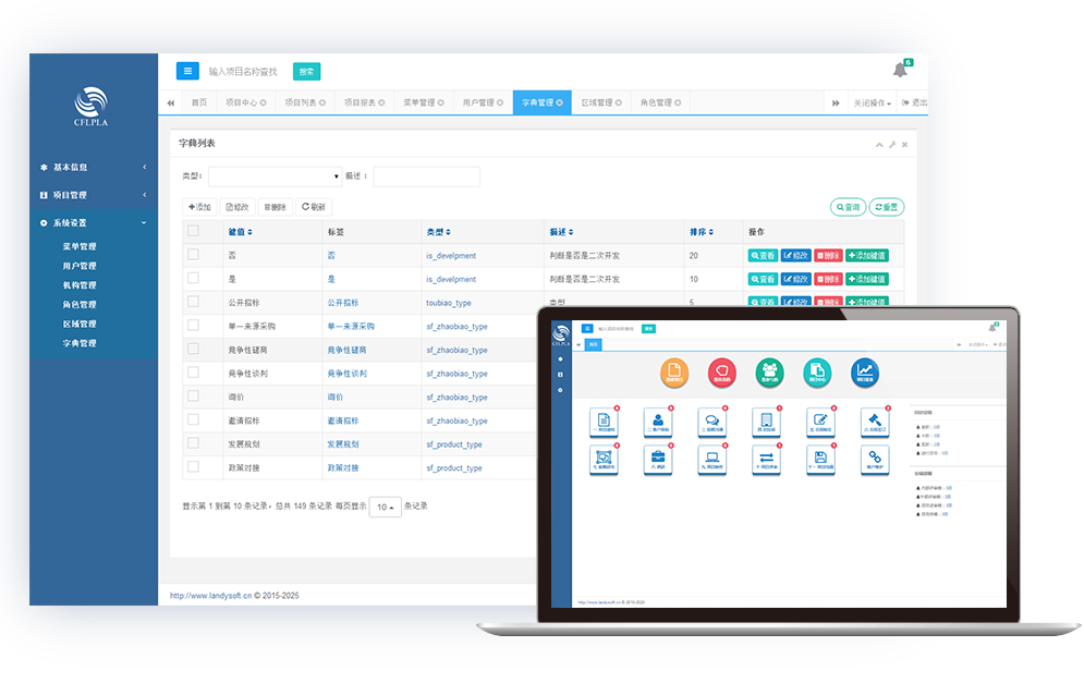 现代物流规划与咨询信息平台是项目招投标管理平台,它对招投标过程的前期准备沟通、招投标、合同的管理、项目的实施过程、项目的评审及回款等流程进行控制,对于流程的审批、人员的指派及后期的考核进行统一的管理。主要模块有:基本信息(客户信息、流程设置、产品线管理)、项目管理(我负责的、我参与的、项目中心、项目列表、项目报表等)、系统设置(菜单管理、用户管理、机构管理、角色管理、区域管理、字典管理等)。