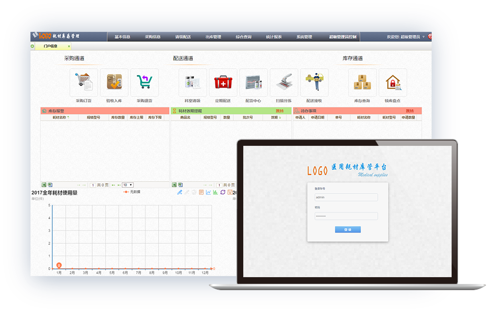 医用耗材库管平台是为各大医院定制的一套医用耗材库存管理软件,库管平台通过和主体采购平台对接,实现对耗材的的采购、入库、库存、发货、领用等功能,对所有耗材进行条码管理。